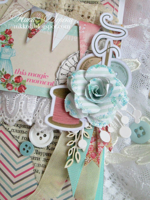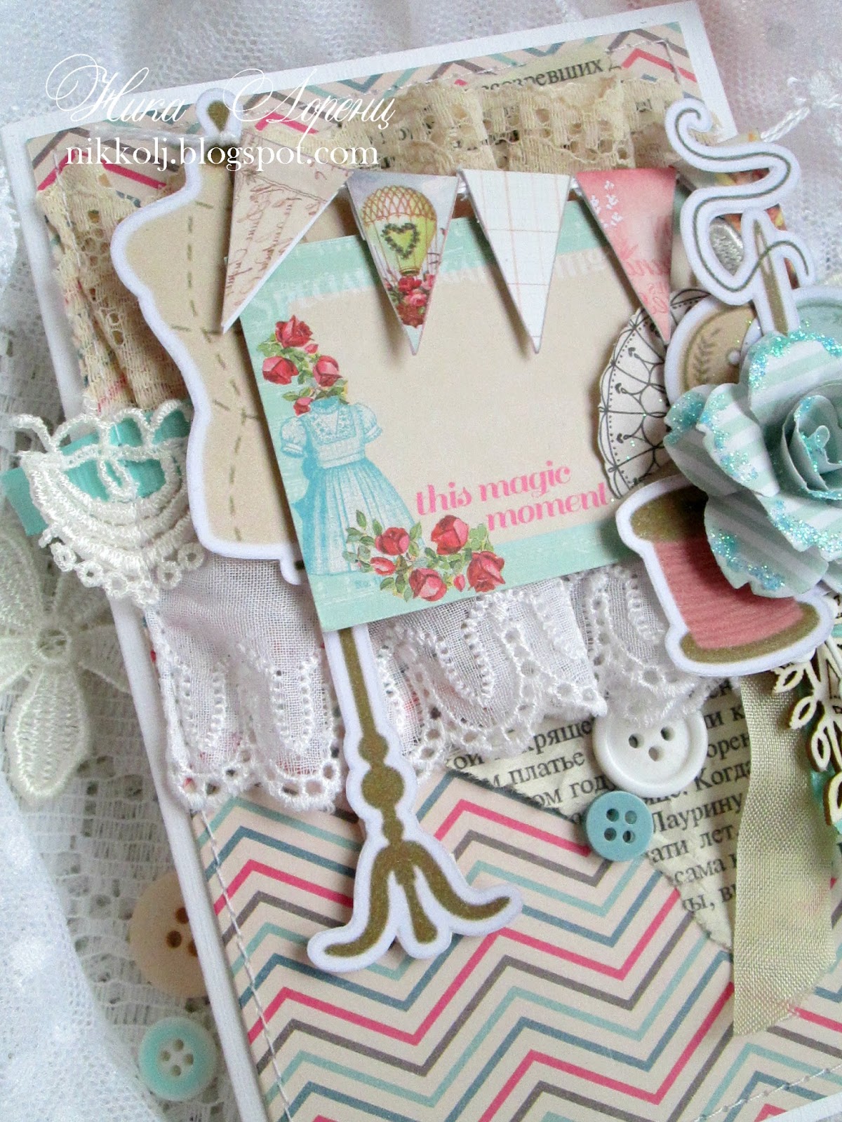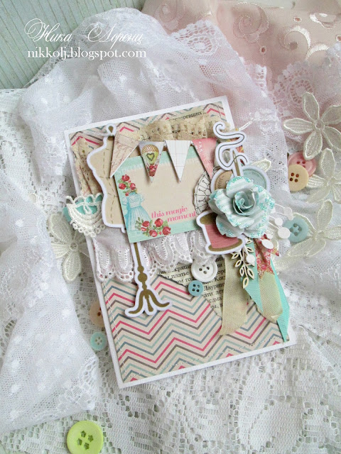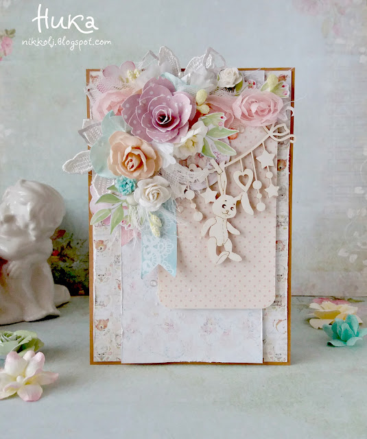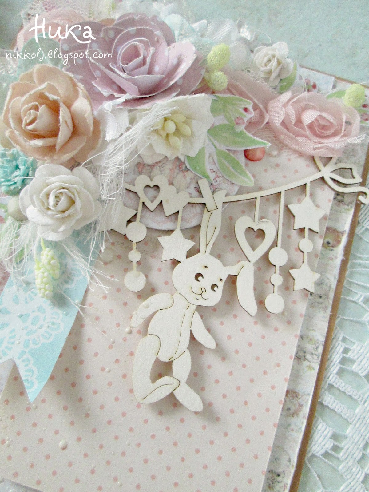 Today I came with my new project - Babu Card for littlle girl in her 1st Birthday. Card in a pastel colours, it based on the yellow colour. Nice horse chipboard from ScrapBox. Many flowers and details, lace and cutting.